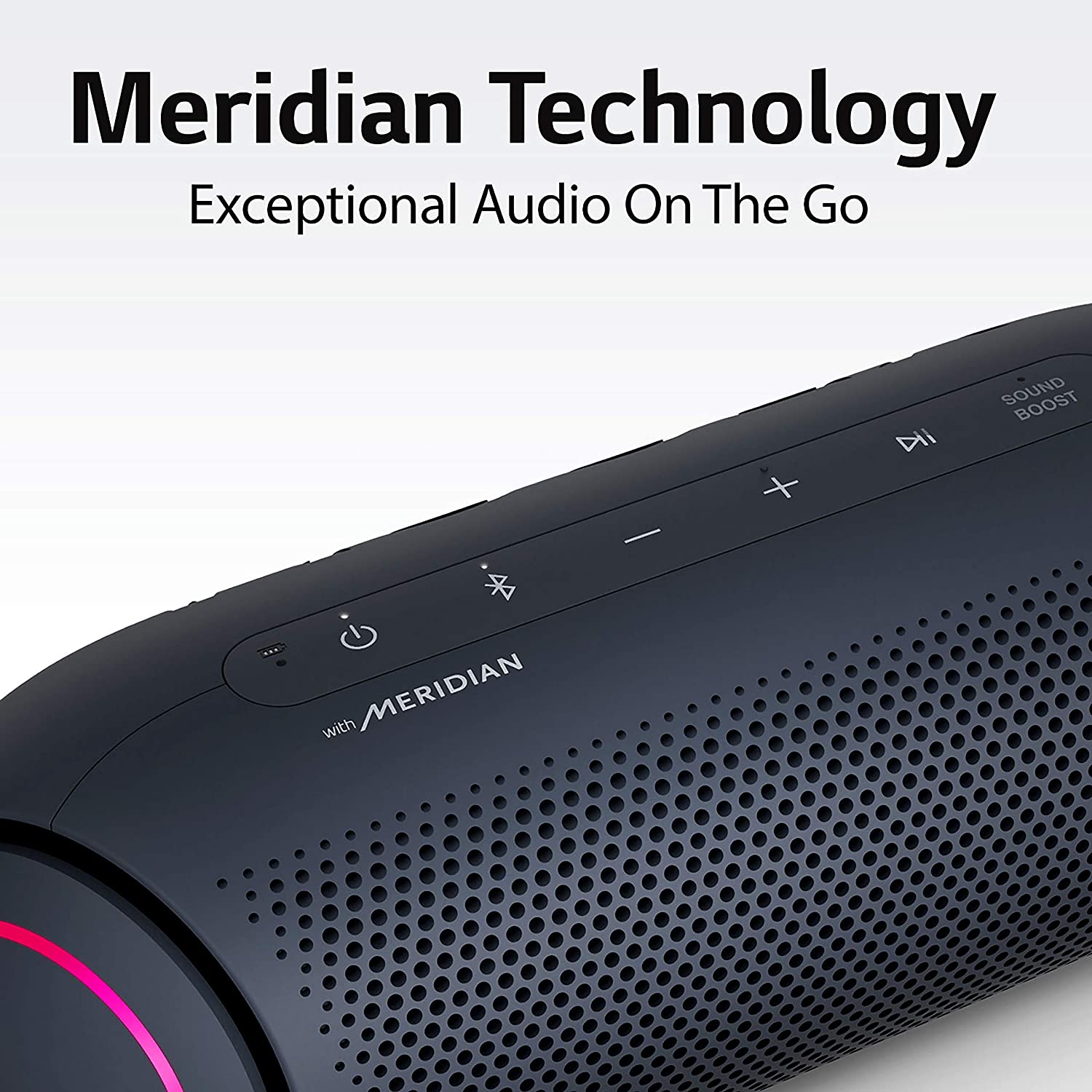 LG XBOOM Go Speaker PL5 Portable Wireless Bluetooth, Dual Action Bass, Sound by Meridian, Water-Resistant, Sound Boost EQ, 18 Hour Battery Life, LED Lighting – Black