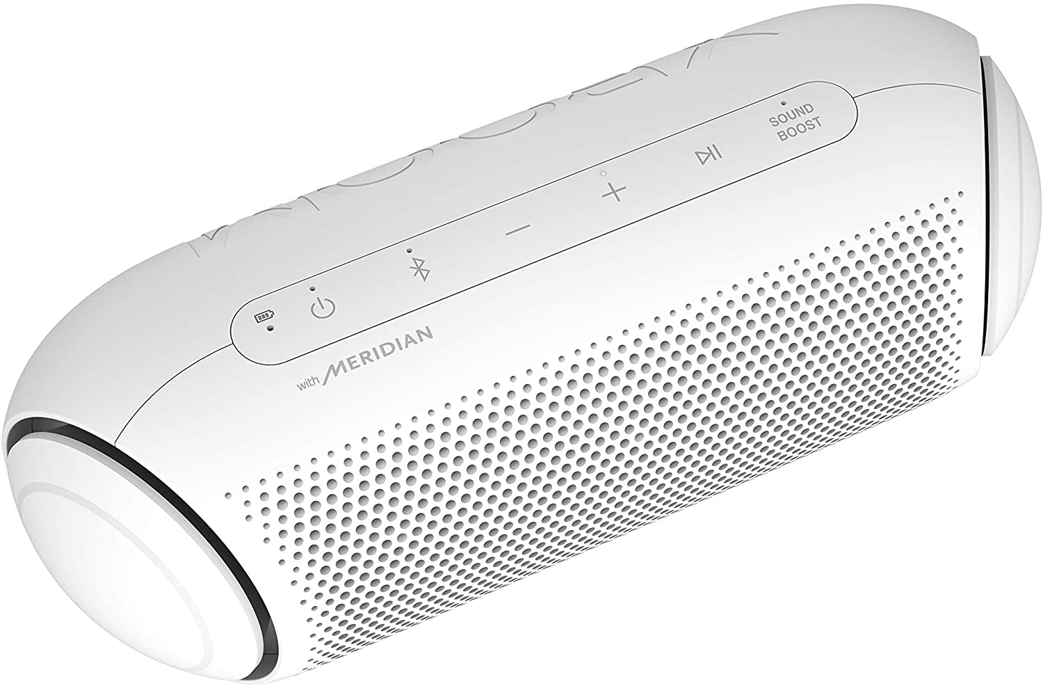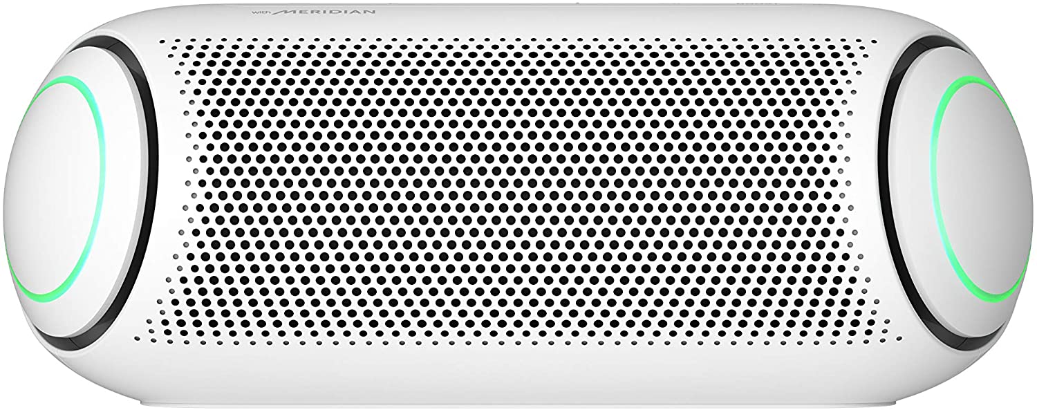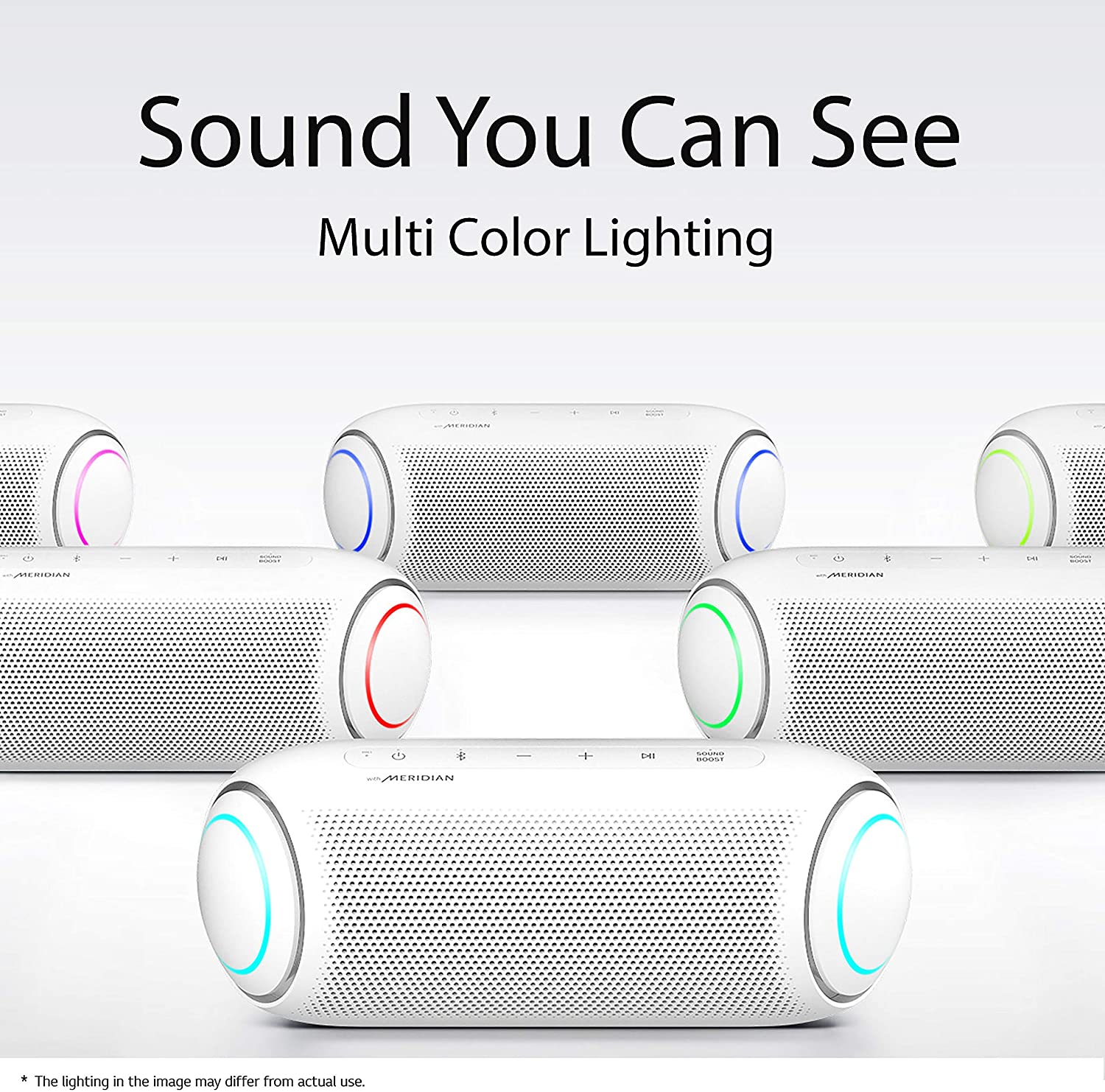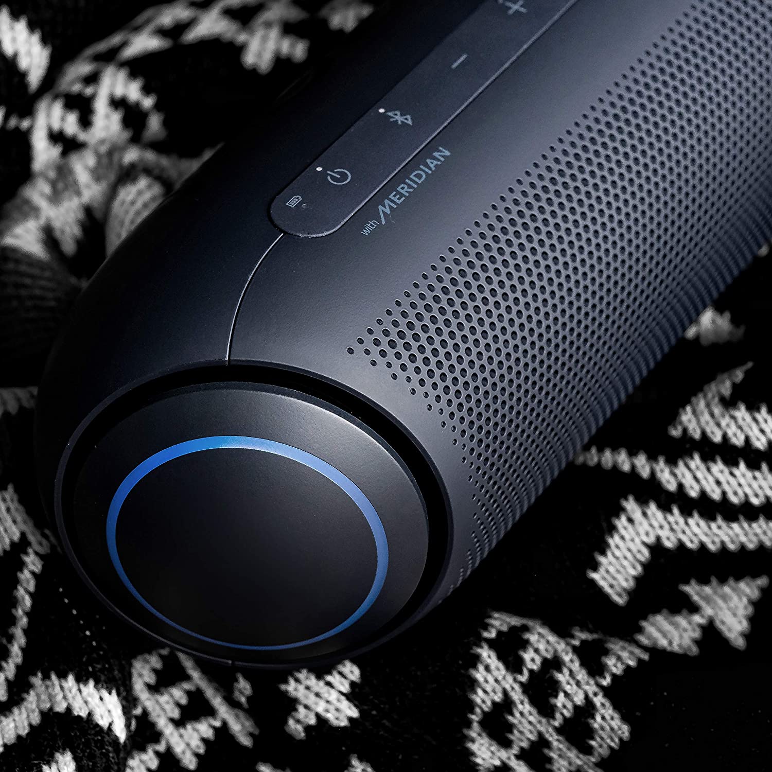 12. A The small, sleek body of the LG XBOOM Go packs a big punch with 20 watts of power and stereophonic sound. With Meridian audio technology and dual passive radiators, you get one powerful speaker that couldn't be easier to pack with you. ^Daphane