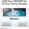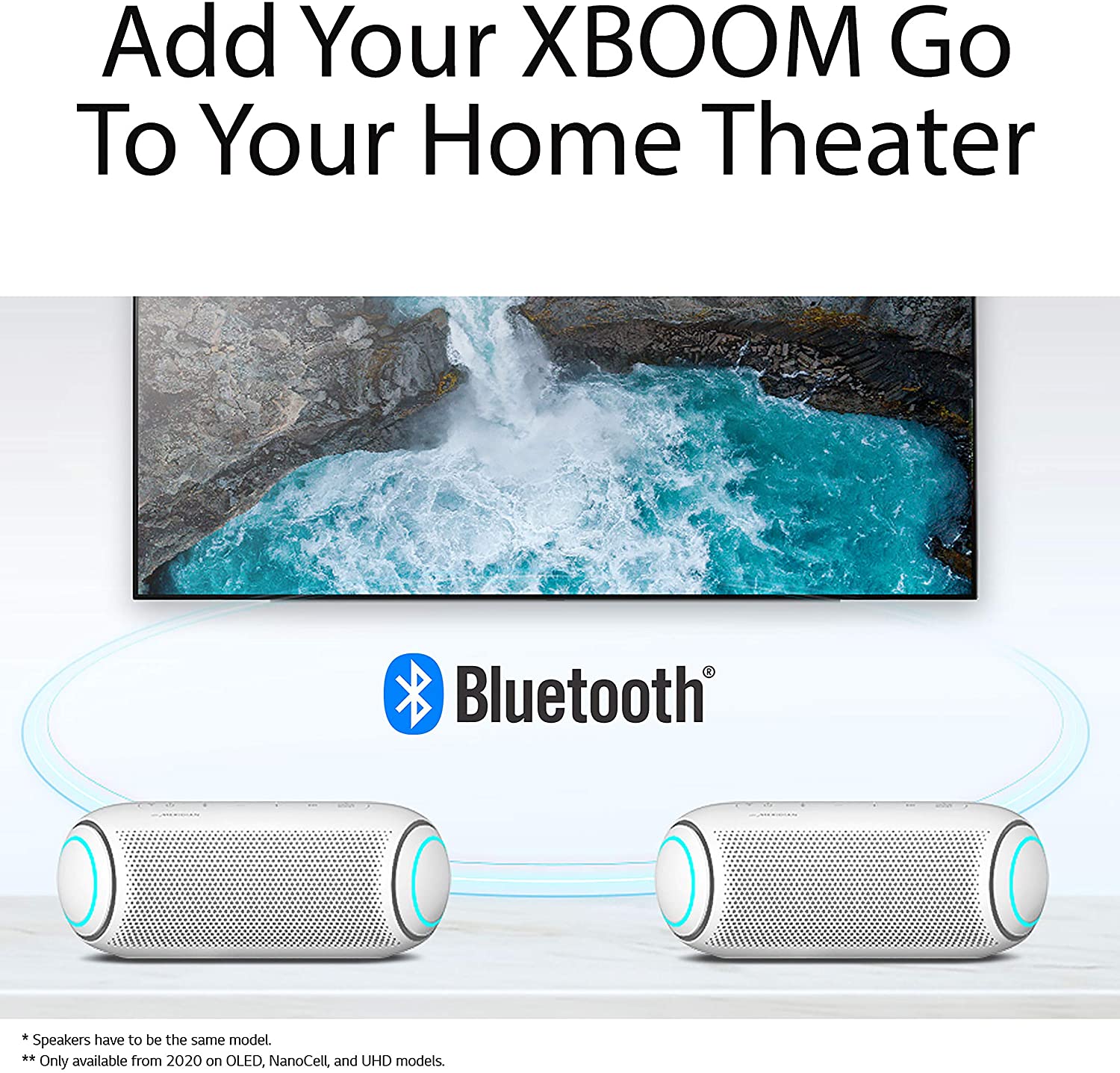 29. A Yes, you can add your LG XBOOM Go to your home theater. The portable Bluetooth speaker easily connects to compatible LG TVs to add rear stereo or surround sound to all your favorite sports, movies and TV shows. ^Daphane